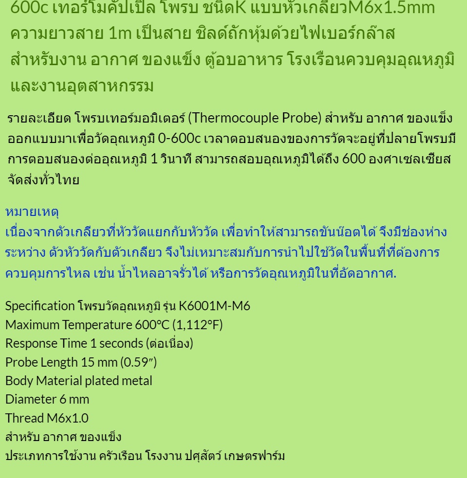 Specification โพรบวัดอุณหภูมิ รุ่น K6001M-M6