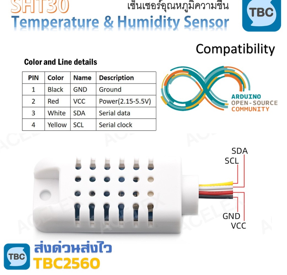 SHT30 เป็นรุ่นต่อสายของ SHT30 ในตัวเครื่องพลาสติกขนาดเล็ก เซ็นเซอร์อุณหภูมิและความชื้น Sensor SHT30 เป็นอุปกรณ์ที่ดีที่สุดและแม่นยำที่สุดเอาต์พุตดิจิตอลที่สมบูรณ์แม่นยำ เชิงเส้น และชดเชยอุณหภูมิ และ SHT30 ที่มีอินเทอร์เฟซ I2C ที่แท้จริงเพื่อให้อ่านง่าย เซ็นเซอร์ SHT30-D มีความชื้นสัมพัทธ์ที่ ±2% และความแม่นยำ ±0.2℃ สำหรับการใช้งานส่วนใหญ่